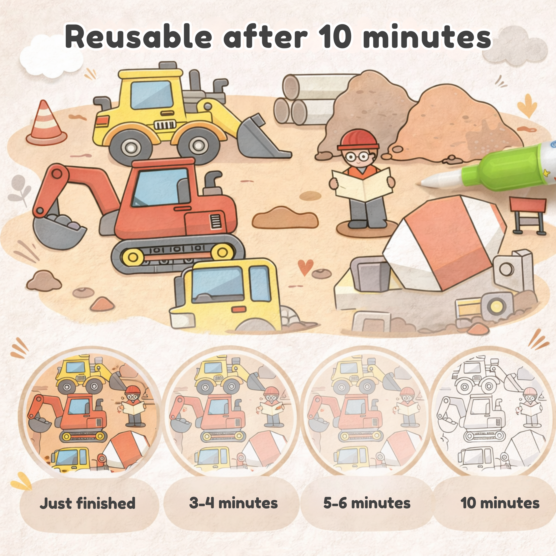 No paint. No ink. No stains. Simply fill the pen with water and watch vibrant colors appear like magic. Once it dries (in about 5–10 minutes), the page resets — ready to be painted again and again.